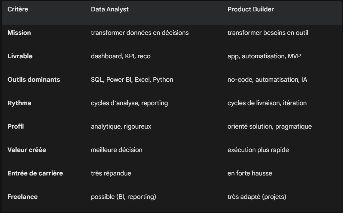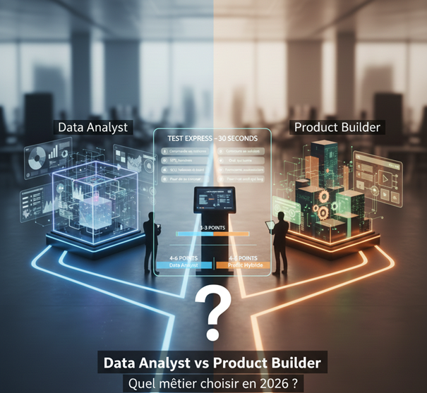 Ici, on compare Data Analyst vs Product Builder en 2026 de façon très opérationnelle : missions réelles, livrables, outils, compétences, débouchés, salaires indicatifs, et profils types. Objectif : que tu puisses trancher vite, sans te tromper, et choisir une formation cohérente avec ton projet.